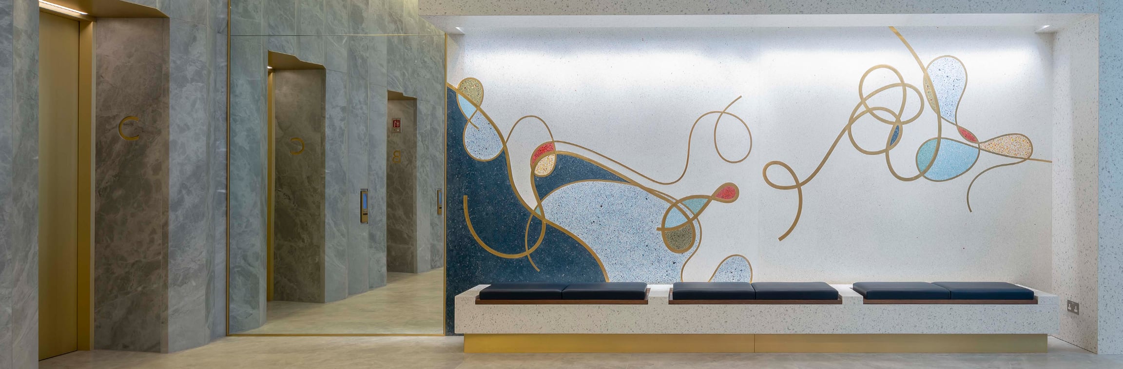 The Marq’s exquisite artwork draws you in as you are greeted by a dynamic double-height entrance, and an Italian marbled floor that wraps up the wall, creating a sense of movement.
